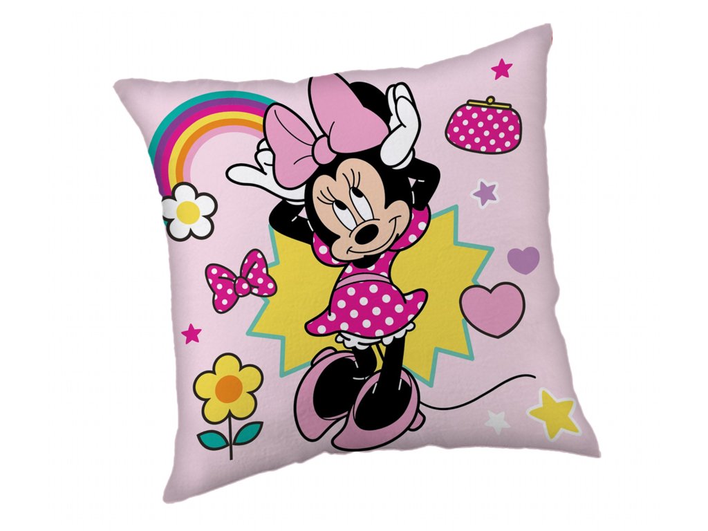 Veselý polštářek s motivem Minnie Mouse přináší radost a barvy do každého dětského pokoje. Minnie má na sobě růžové puntíkované šaty a mašli, a zvedá ruce s úsměvem. Pozadí zdobí duha, květiny, srdíčka, hvězdičky a malá kabelka. Rozměr 40×40 cm, ideální pro malé princezny a fanoušky Disneyho.