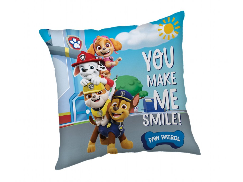Roztomilý polštářek s motivem oblíbených hrdinů z Tlapkové patroly potěší každého malého fanouška. Na přední straně jsou postavičky z Paw Patrol s nápisem „YOU MAKE ME SMILE!“ a logem seriálu. Ideální do dětského pokoje pro pohodlí i radost.