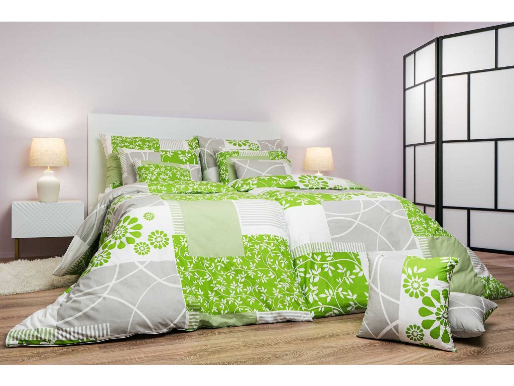 Stylové ložní prádlo Bluemoon zelený kombinuje květinové motivy s geometrickými prvky v odstínech zelené, bílé a světle šedé. Tento moderní a zároveň přírodní design přináší do ložnice svěžest a harmonii. Povlečení doporučujeme kombinovat s prostěradly v barvě bílá, světle šedá, kiwi nebo hrášková. Vyrobeno v České republice firmou DADKA VRACOV.