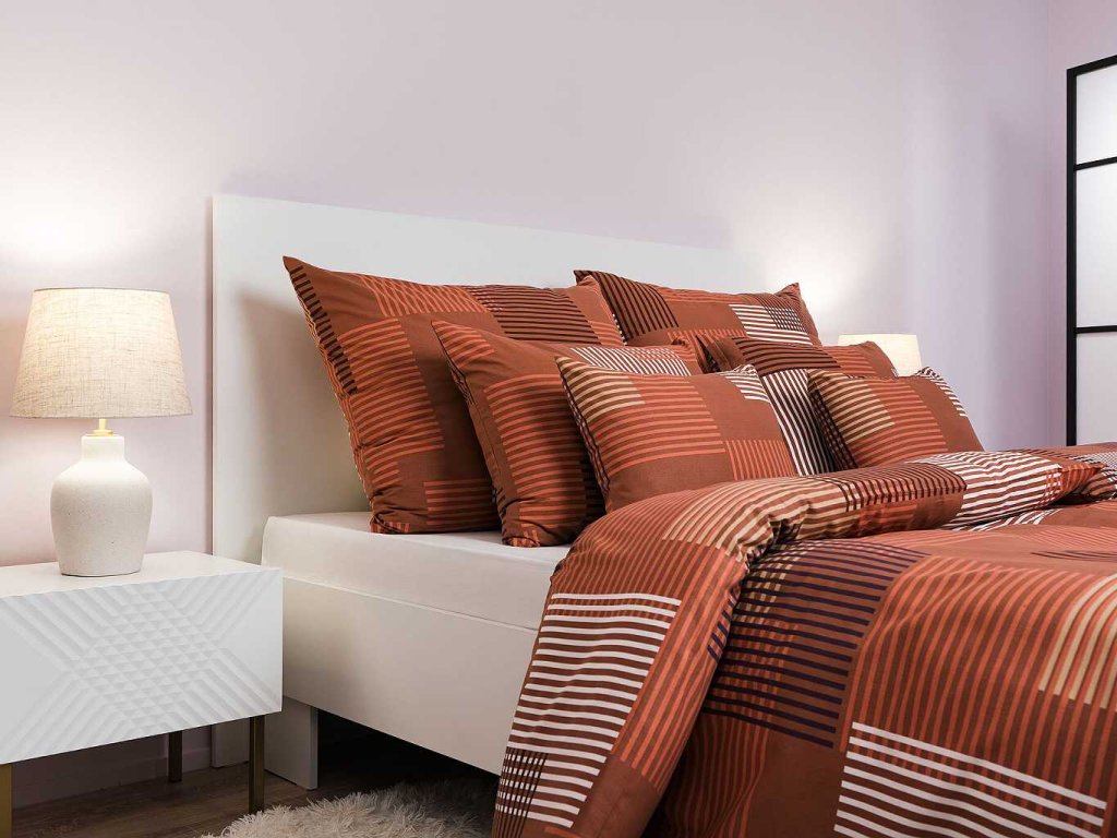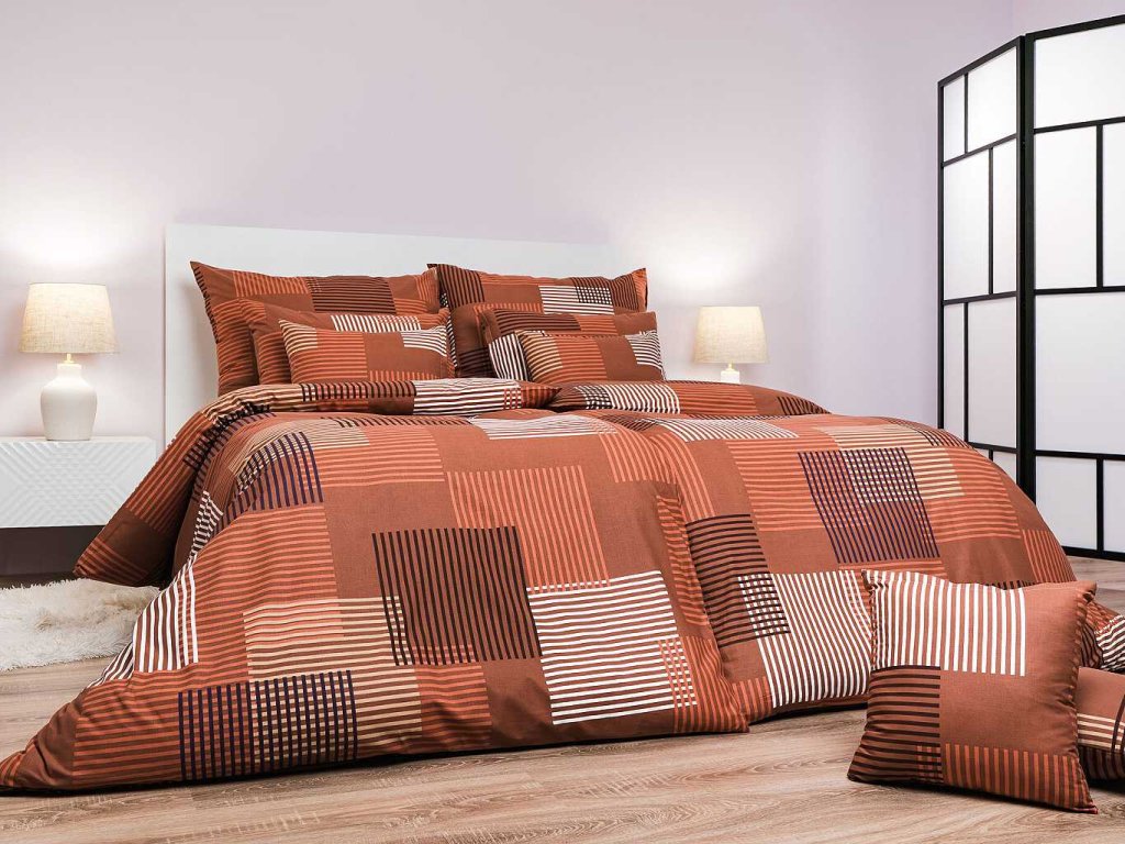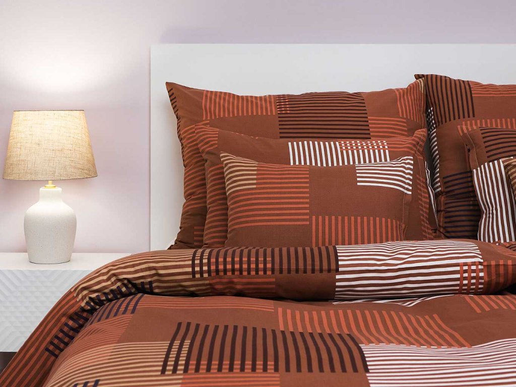 Moderní ložní prádlo s výrazným geometrickým vzorem Patrik hnědý v odstínech hnědé, béžové a bílé přináší do ložnice teplý a útulný vzhled. Kombinace obdélníků a linií vytváří harmonický a zároveň dynamický design. Povlečení doporučujeme kombinovat s prostěradly v barvě bílá nebo nugátová. Vyrobeno v České republice firmou DADKA VRACOV.
