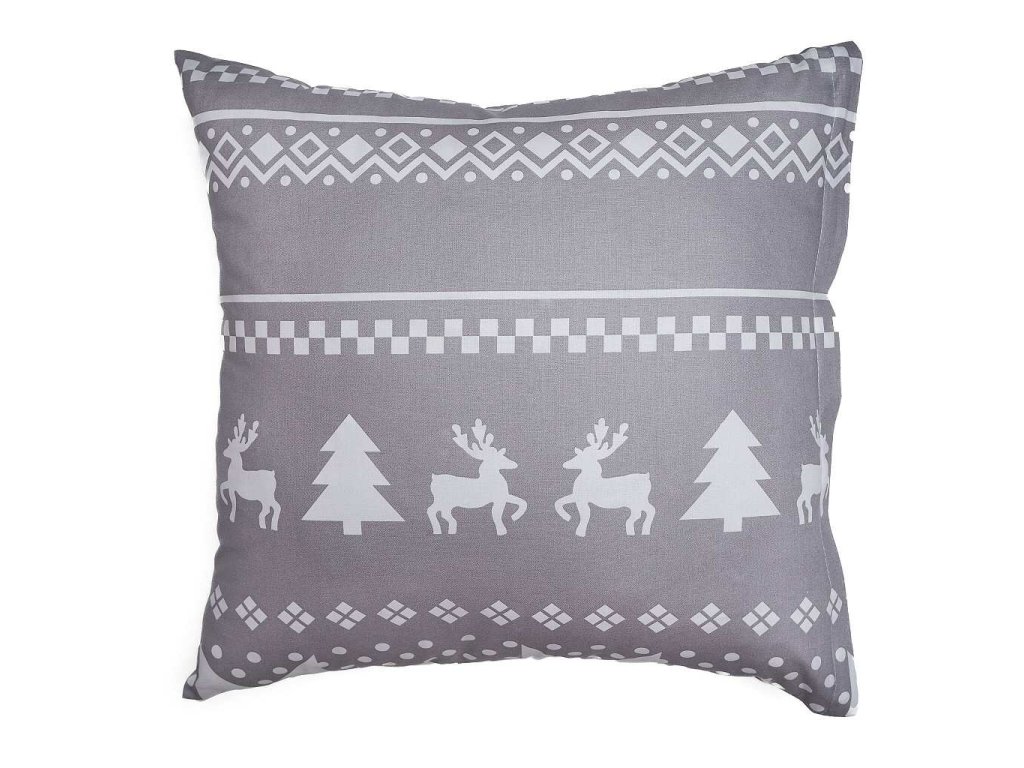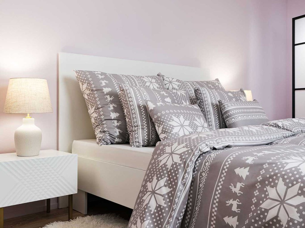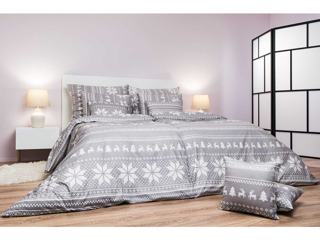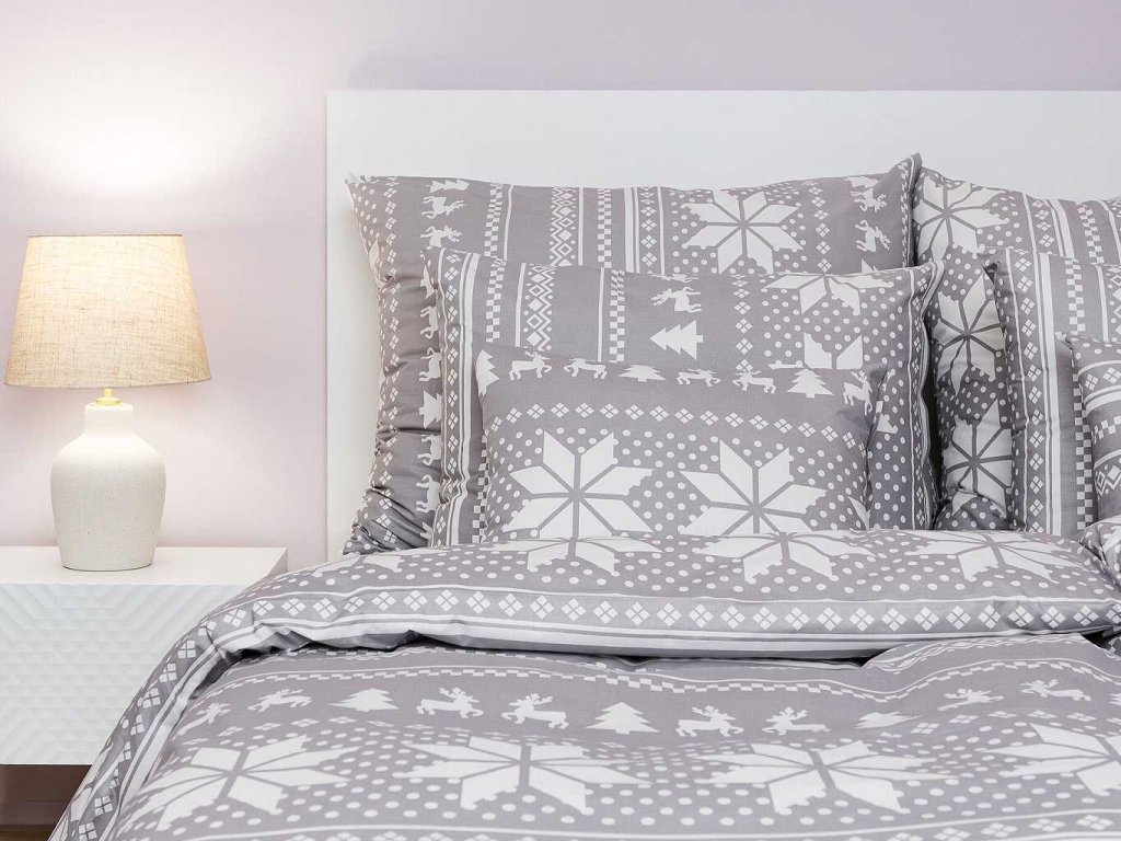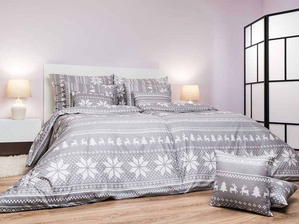 Stylové ložní prádlo Sobi šedí s motivem sněhových vloček, sobů a stromků v bílé barvě na šedém podkladu přináší do ložnice útulnou zimní atmosféru. Doporučujeme kombinovat s prostěradly v barvě bílá nebo šedá. Vyrobeno v České republice firmou DADKA VRACOV.