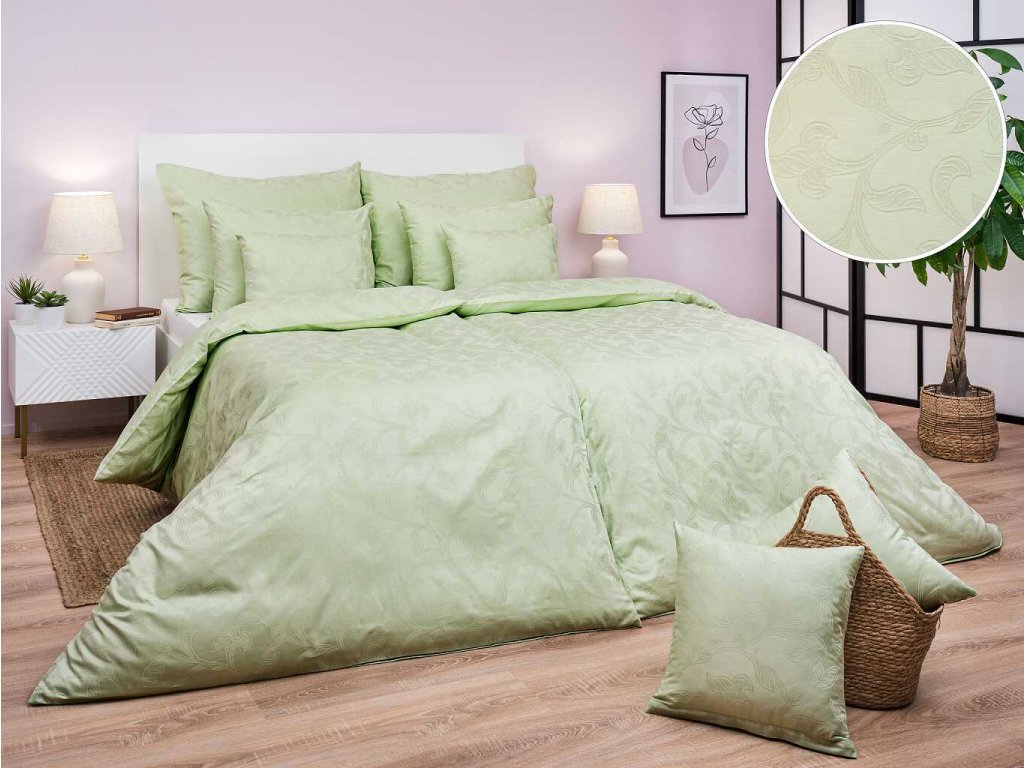 Elegantní damaškové povlečení Rokoko zelené přináší do ložnice svěží a uklidňující atmosféru. Jemný rostlinný vzor vytkaný v moderní světle zelené barvě působí luxusně a nadčasově. Díky použití 100% česané egyptské bavlny si užijete příjemný, měkoučký a kvalitní spánek každou noc.