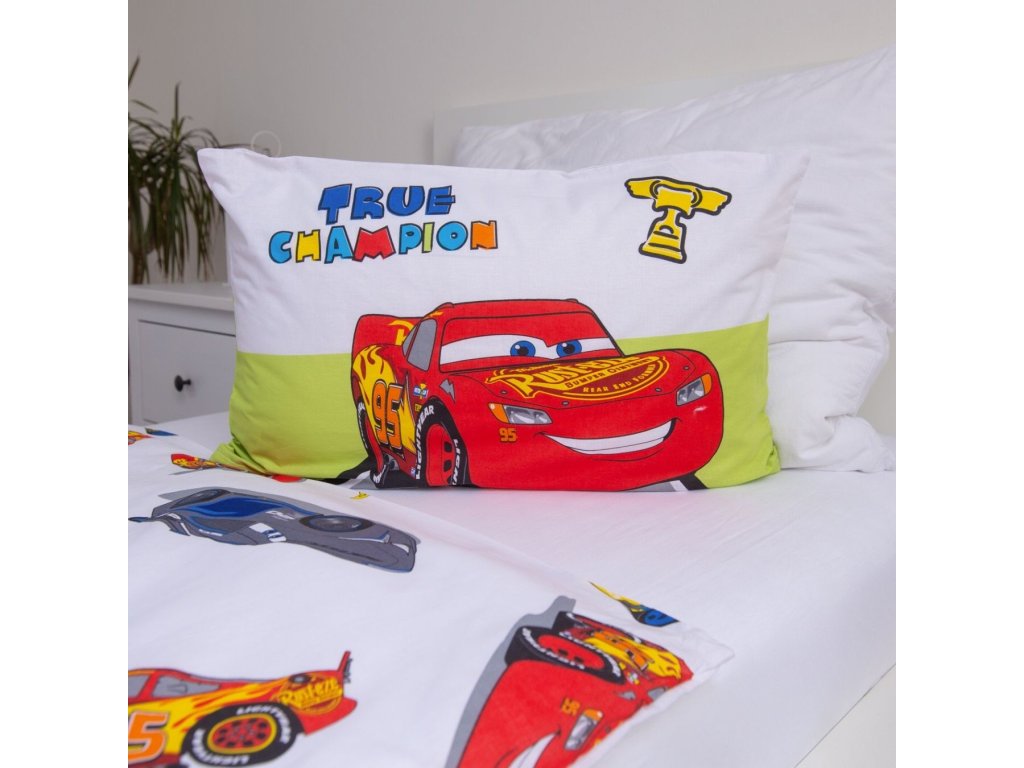 Zažijte závodní vzrušení s povlečením Cars Champion! Design s Bleskem McQueenem v čele závodu, doplněný o nápisy „LIGHTNING MCQUEEN“ a „TRUE CHAMPION“ s trofejí, přináší energii a radost do každé dětské postýlky. Ideální pro malé fanoušky filmu Cars!