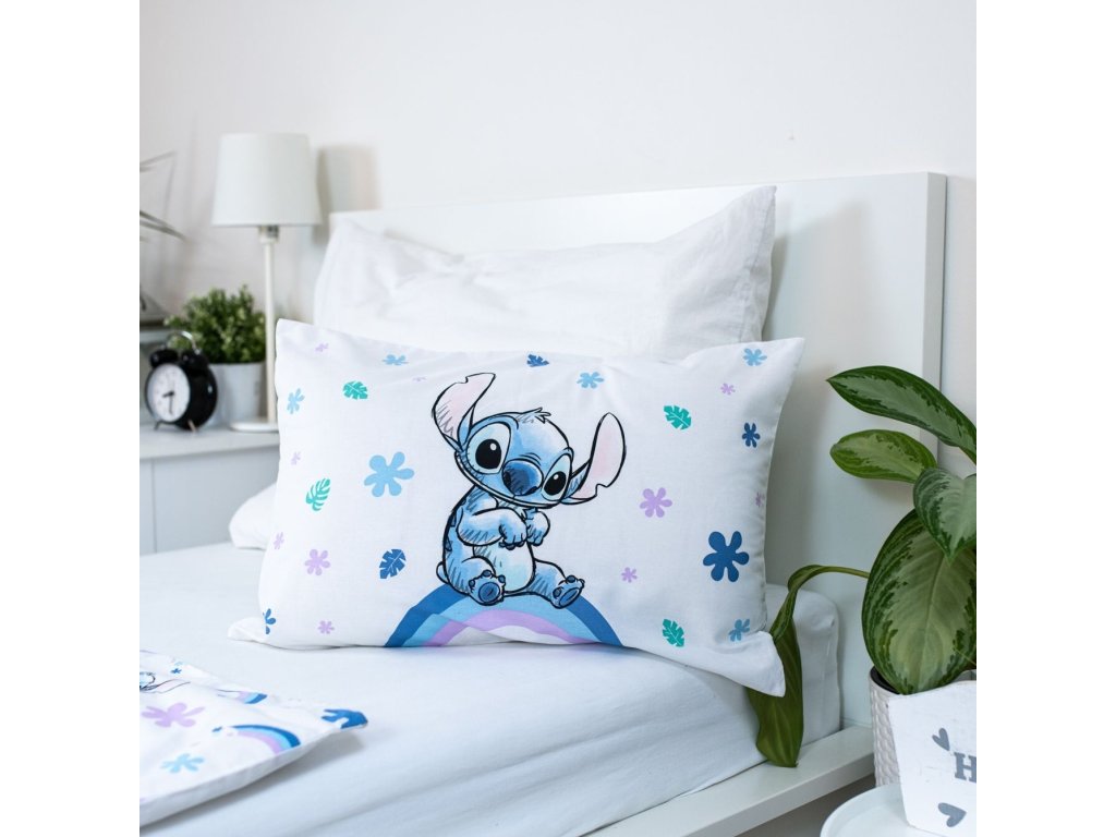 Povlak na polštář doplňují menší obrázky Stitche v různých pozicích spolu s květinovými motivy, což vytváří harmonický a vizuálně poutavý celek. Jemné pastelové barvy a přátelský motiv přinášejí do dětského pokoje klid a pohodu.