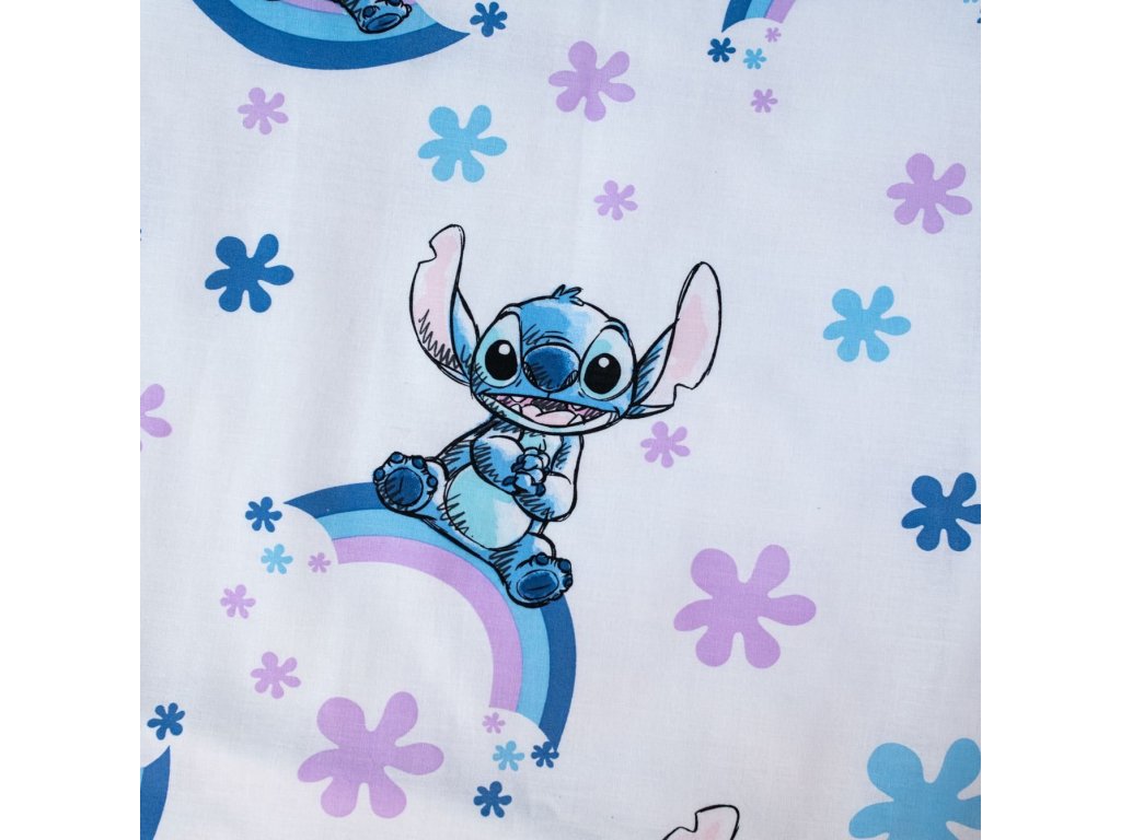 Hlavní hrdina Stitch se na přikrývce usmívá v roztomilé póze, obklopený barevnými květinami a zelenými listy. Nad ním se klene duhový oblouk, který dodává celému designu hravost a kouzelnou atmosféru.
