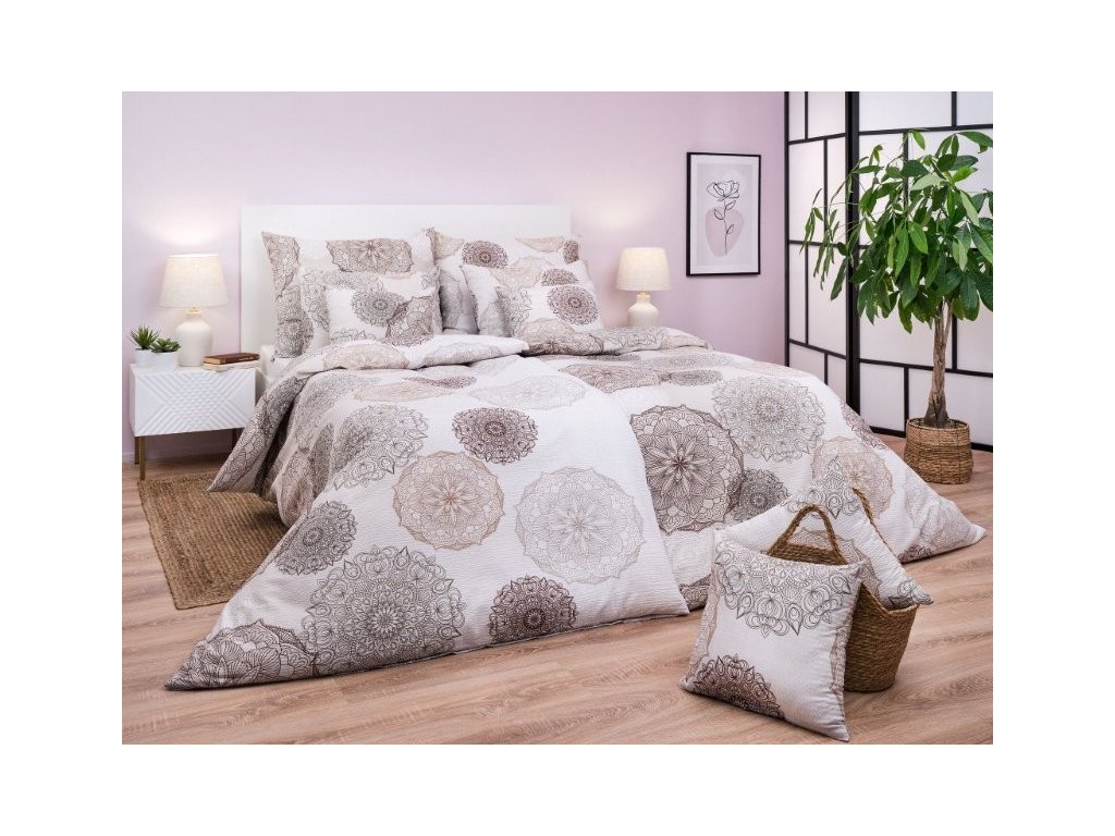 Luxusní ložní prádlo Magic banán s elegantním mandalovým motivem v hnědých a béžových tónech na světlém podkladu přináší do ložnice harmonii a styl. Nejlépe vynikne v kombinaci s prostěradlem v barvě bílé, tmavě hnědé nebo opál. Vyrobeno v České republice firmou DADKA VRACOV.