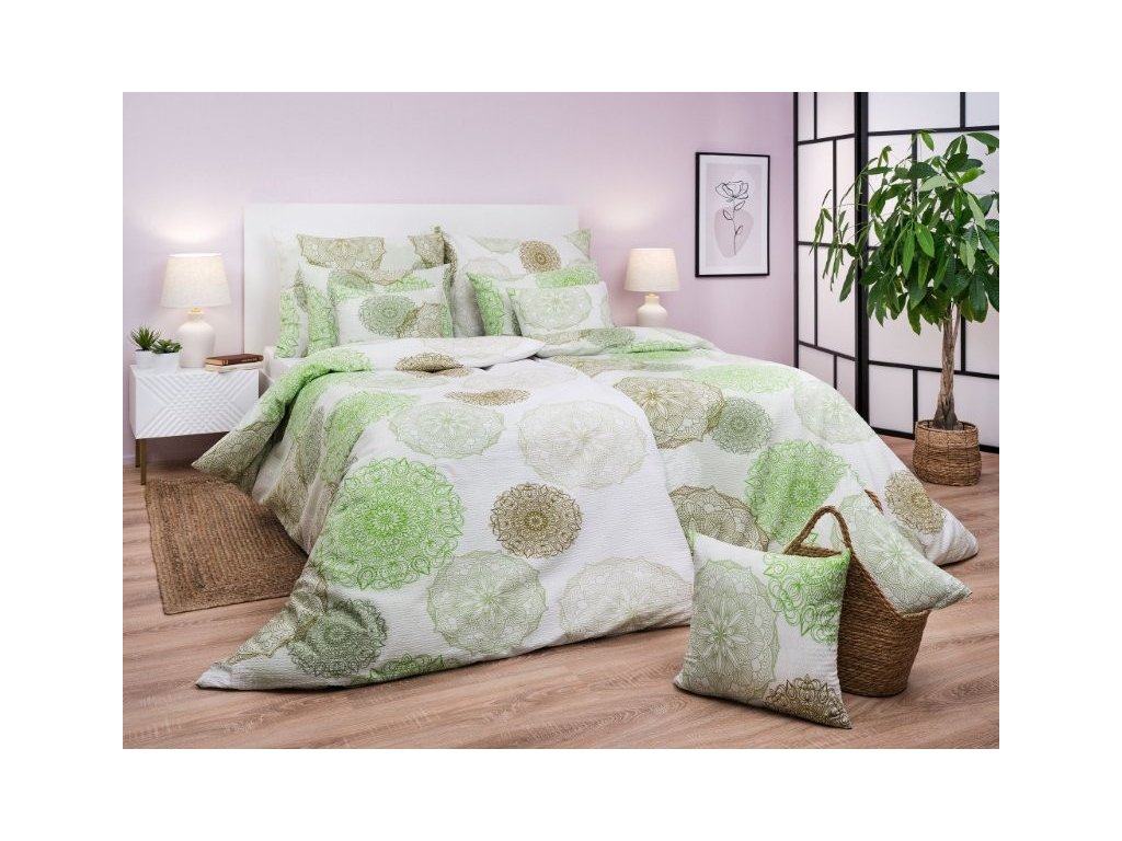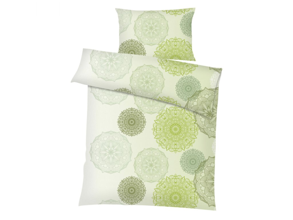 Luxusní ložní prádlo Magic světle zelená s elegantním mandalovým motivem v odstínech zelené a béžové na světlém podkladu přináší do ložnice harmonii a svěžest. Nejlépe vynikne v kombinaci s prostěradlem v barvě olivové, hráškové, bílé, banánové nebo kiwi. Vyrobeno v České republice firmou DADKA VRACOV.