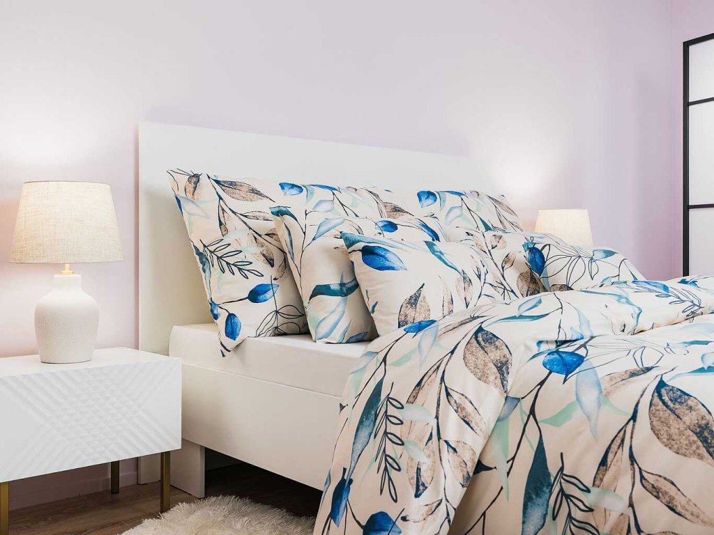 Luxusní ložní prádlo Milaya banán s moderním přírodním motivem v modrých a béžových tónech na světlém podkladu přináší do ložnice eleganci a svěžest. Nejlépe vynikne v kombinaci s prostěradlem v barvě královsky modré, denim, banán, světle hnědé, mentol nebo opál. Vyrobeno v České republice firmou DADKA VRACOV.