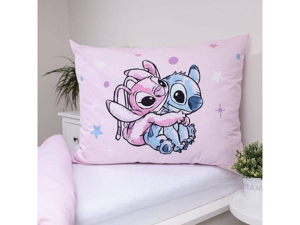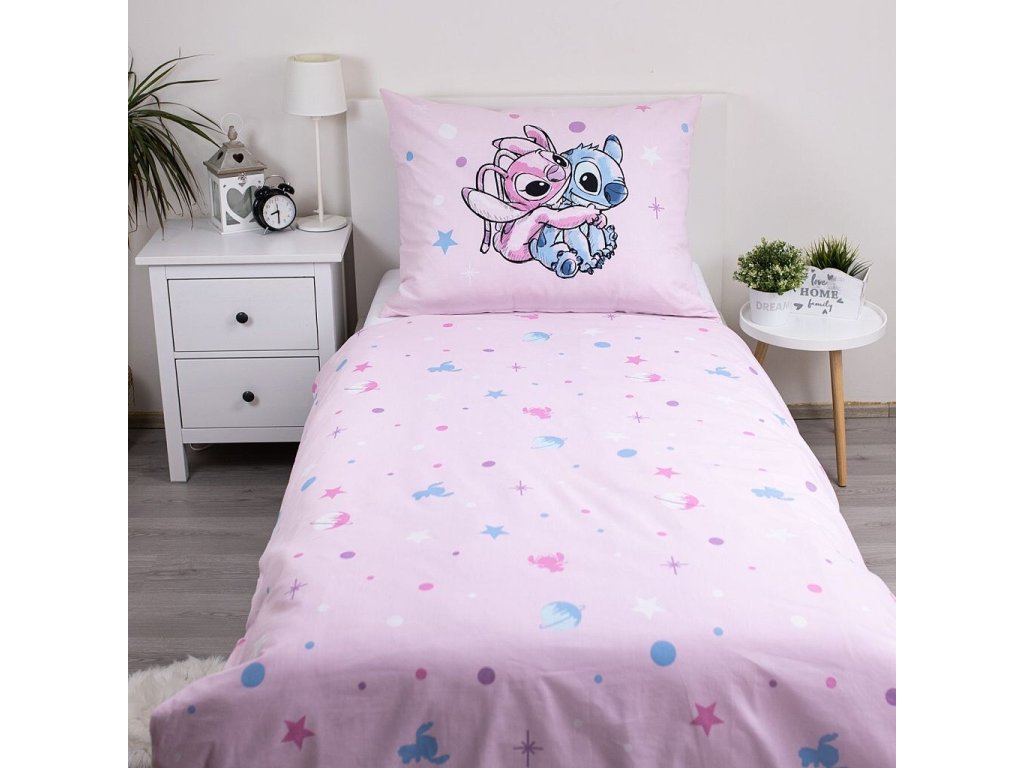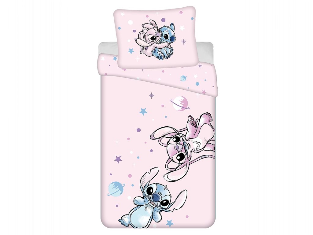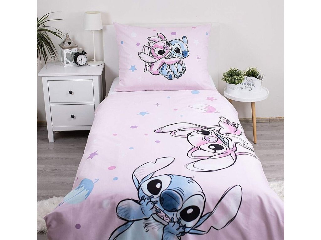 Objevte vesmírná dobrodružství s povlečením Lilo a Stitch Universe! Růžové pozadí s postavami Stitche a Angel, doplněné o hvězdy, planety a vesmírné prvky, rozzáří každý dětský pokoj.