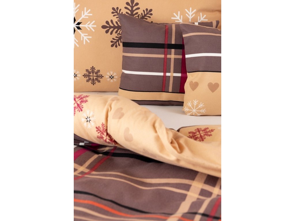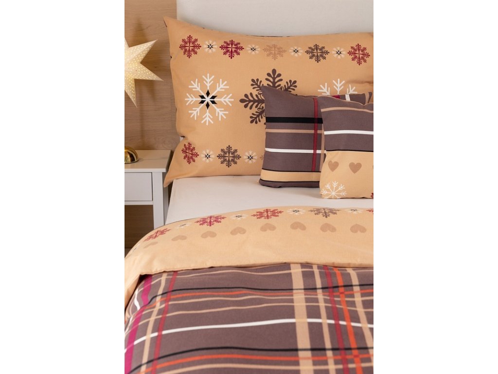 Povlak na přikrývku je z obou stran stejný, povlak na polštář tvoří na spodní straně károvaný motiv s nugátově hnědým podkladem. Povlečení je opatřeno komfortním zipovým uzávěrem.