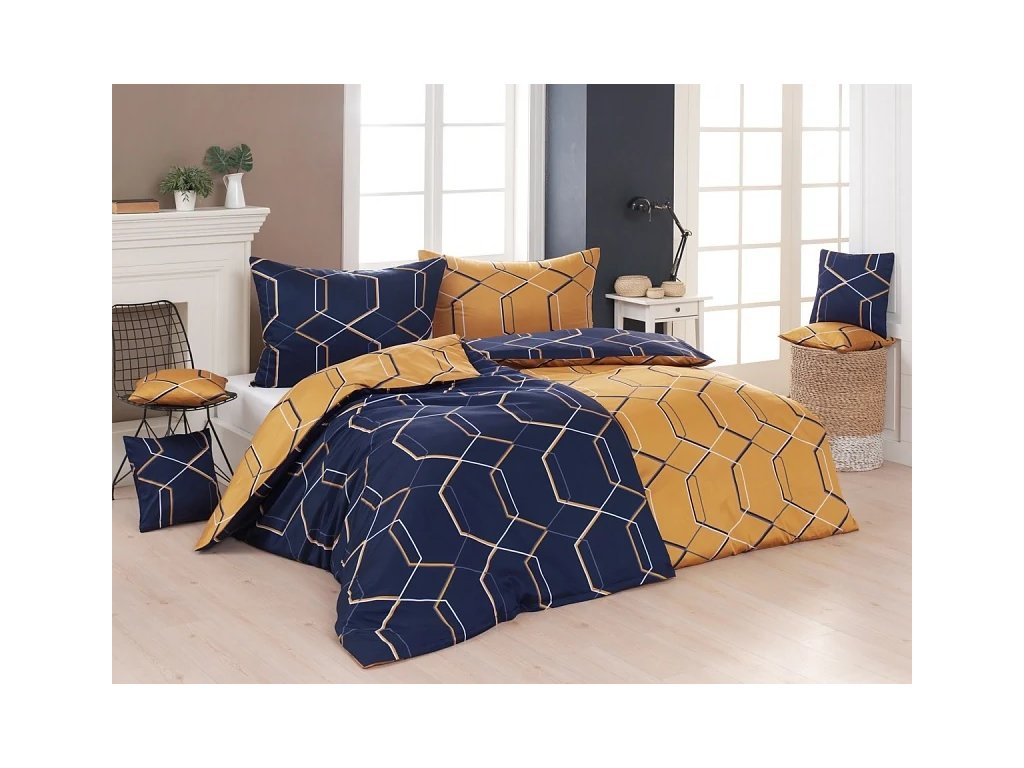 Dokonalé spojení barev s nápaditým geometrickým vzorem přináší ložní povlečení Ricci. Díky oblíbenému oboustrannému provedení si vyberete, zda bude vaše postel laděná do modra nebo zazáří ve zlatavých tónech, případně si ji podle nálady nakombinujete dle vlastní chuti.