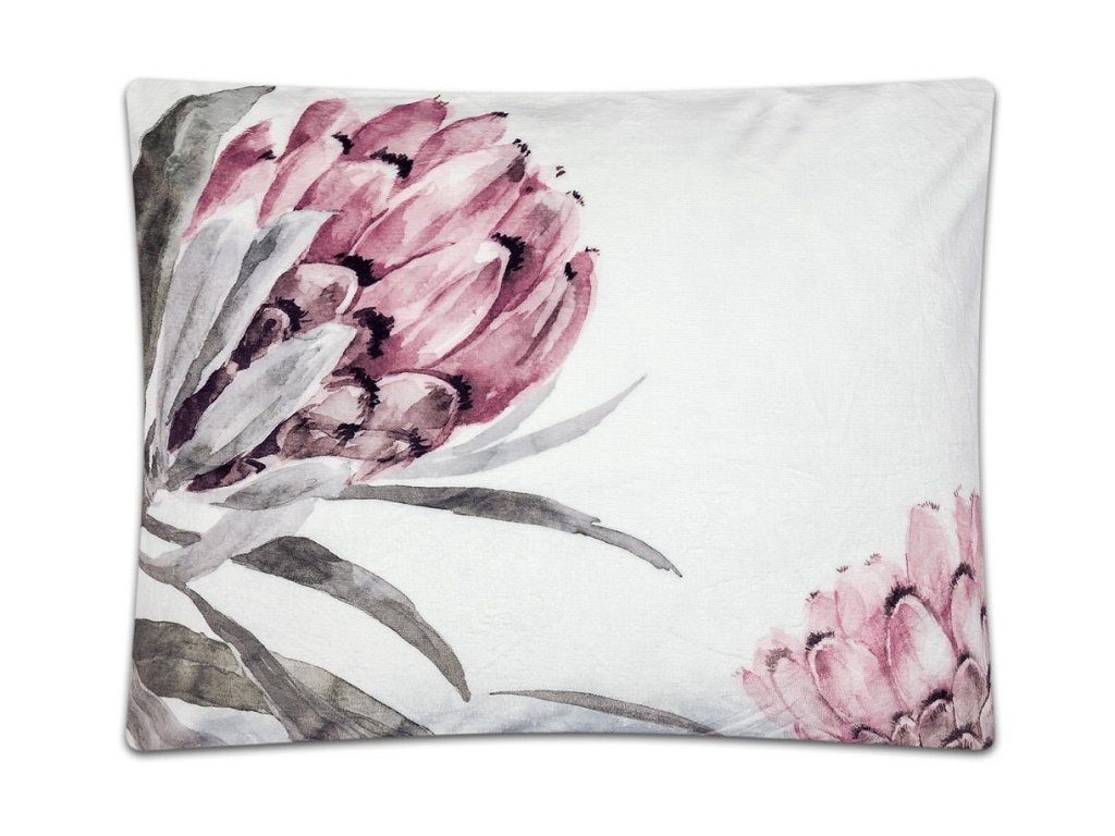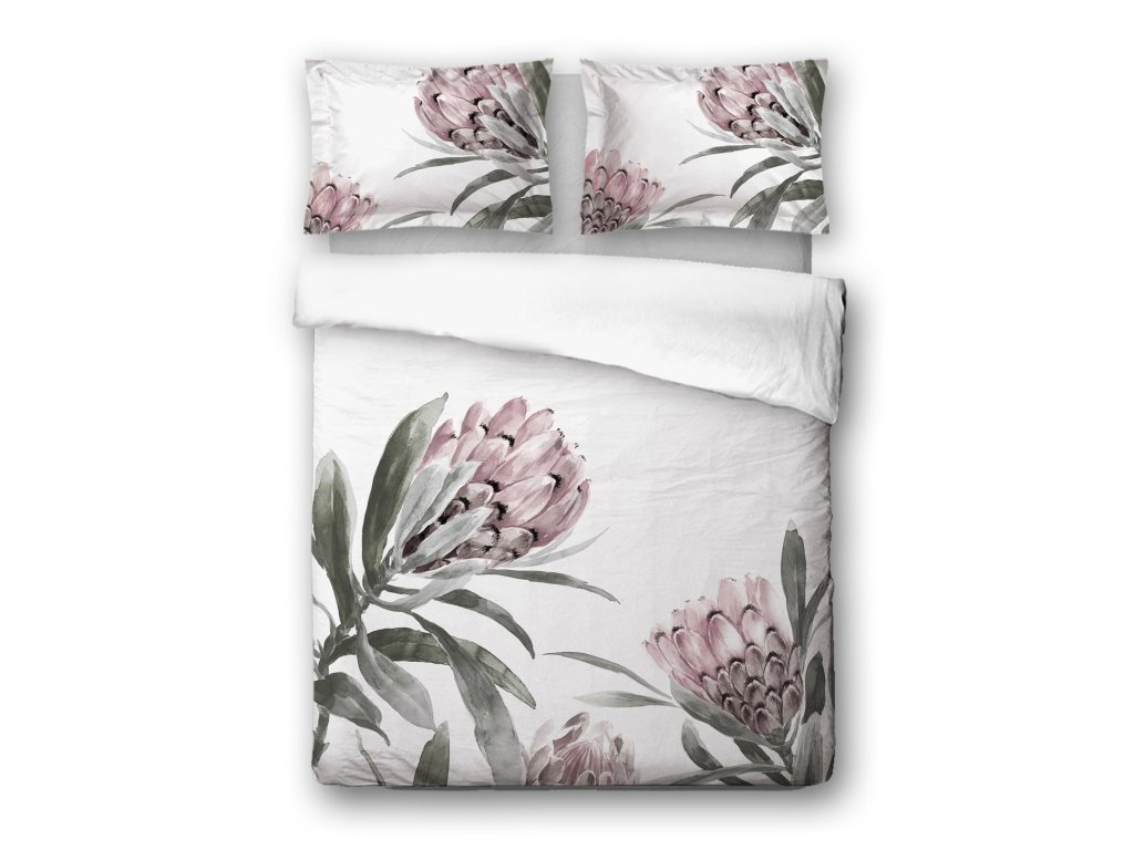 Luxusní povlečení Mikroflanel Botanika značky SLEEP WELL® přináší do ložnice svěžest přírody a maximální pohodlí. Bílý podklad s velkými květy protey v růžových a bílých tónech doplněný zelenými listy vytváří elegantní botanický vzhled.
