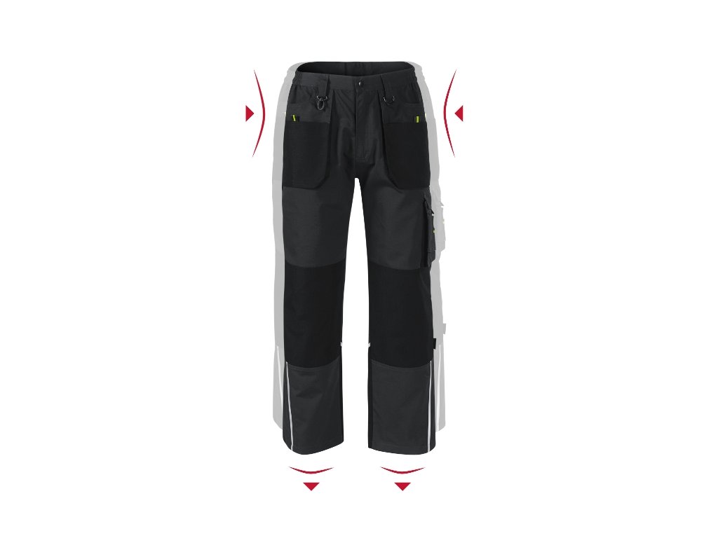 pruženka v boční části pasového límce 10 multifunkčních kapes zdvojený materiál v oblasti kolen plastové "D" poutko a karabina na klíče a ID karty poutko na kladivo dvojité prošití pro vyšší odolnost vysoce odolný materiál CORDURA® v barvě 01 retroreflexní prvkyPlátnová vazba, 65 % polyester, 35 % bavlna, 270 g/m²; CORDURA® 100 % polyamid, 210 g/m²