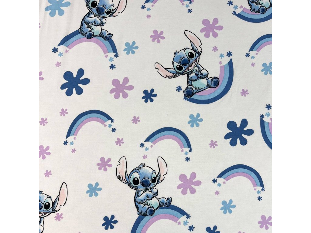 Design prostěradla je veselý a hravý, s opakujícím se vzorem postavičky Stitche v různých pozicích, doplněný barevnými duhovými oblouky a květinovými motivy v pastelových barvách.