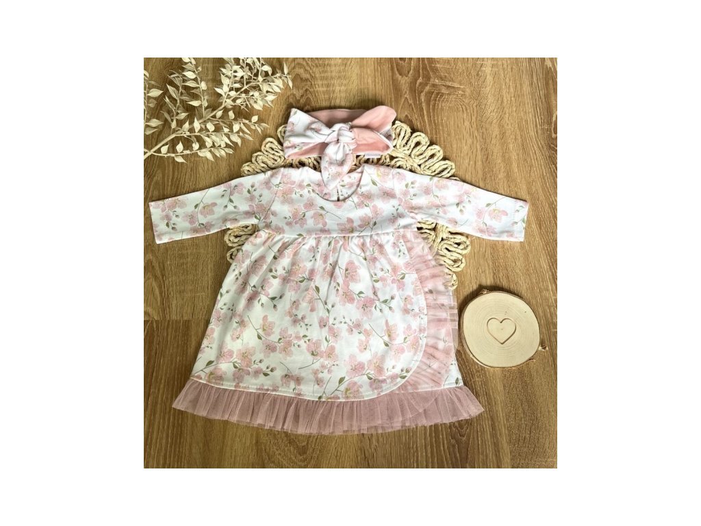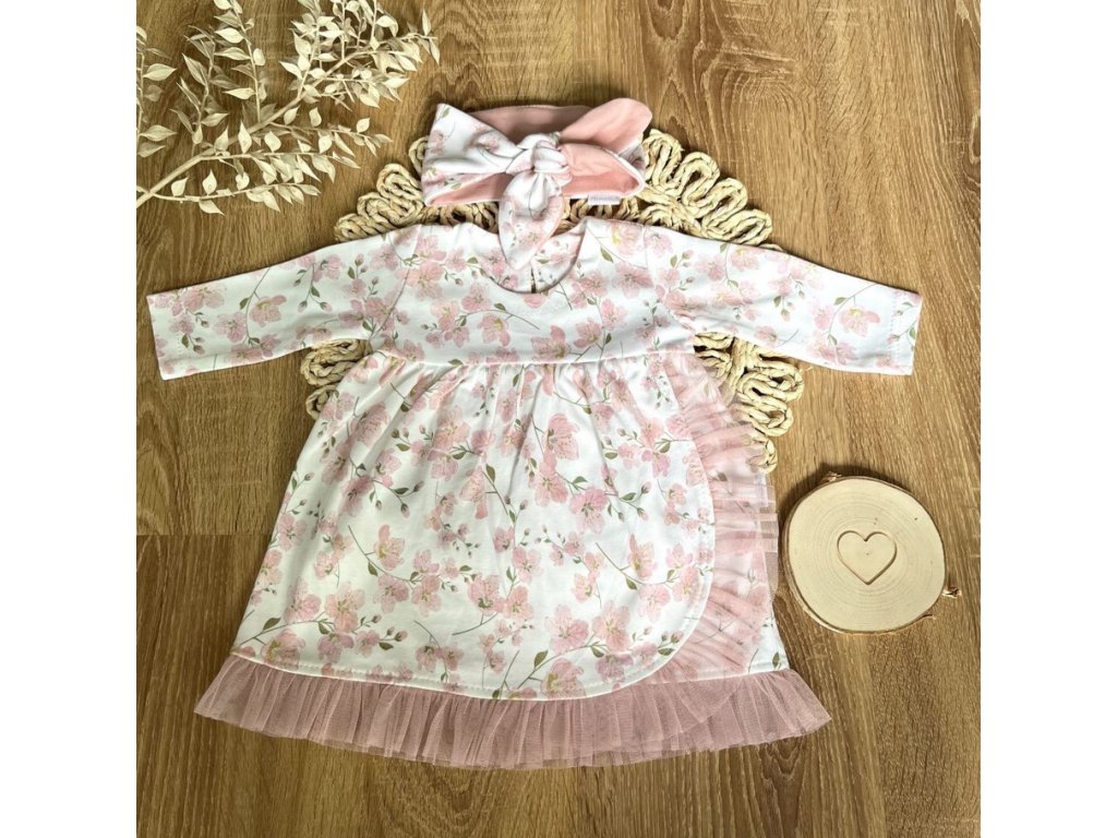 Šaty s tylovým lemem dl. rukáv, Květy višní, Mamatti, smetanovo/pudrové