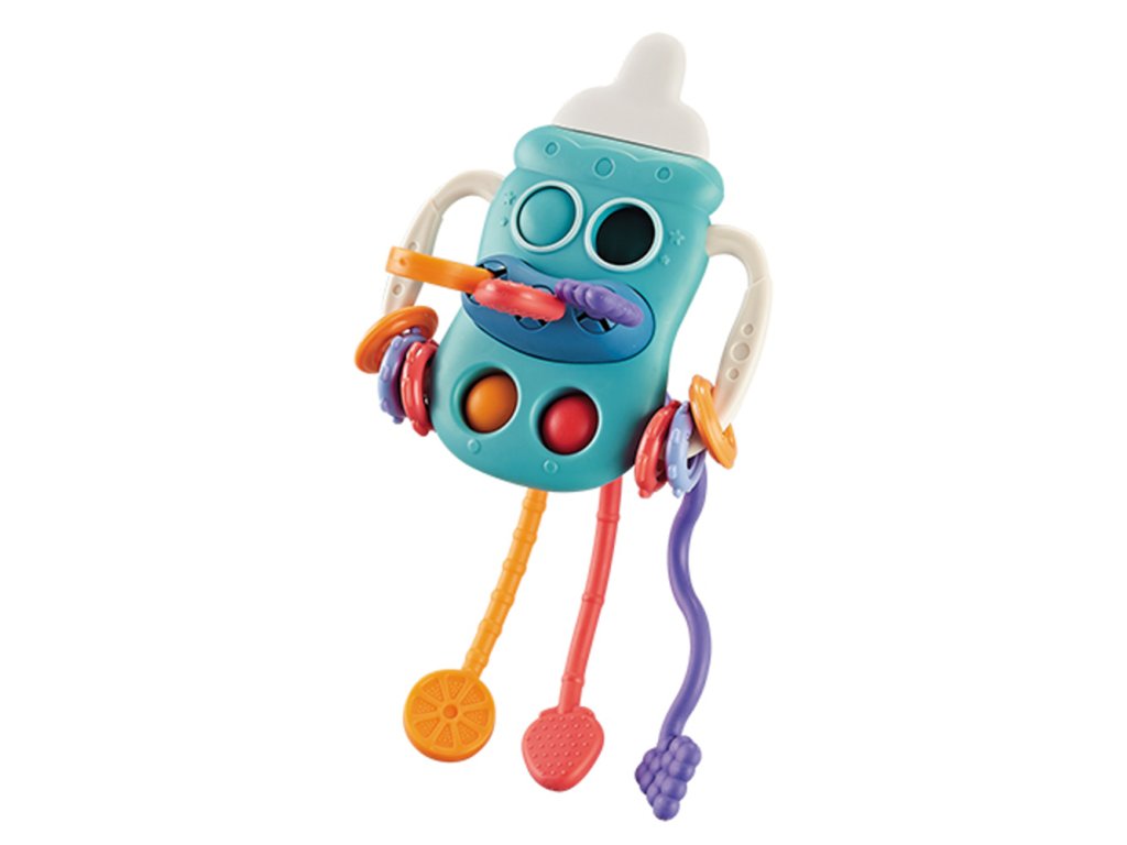 Senzorická hračka Láhev. Multifunkční senzorická hračka určená k podpoře komplexního rozvoje dětí. Stimuluje rozvoj motoriky u dětí. Zlepšuje také flexibilitu a koordinaci malých prstů. Hračka se skládá z různých prvků vyrobených z bezpečného silikonu a odolného plastu. Můžete jej stisknout, stisknout, vytáhnout a přesunout. Zvyšuje atraktivitu v očích dítěte a podporuje aktivní a kreativní objevování. Vyznačuje se výraznými a kontrastními barvami, které přitahují pozornost batolete a pomáhají mu naučit se rozlišovat barvy a tvary. Hračka aktivně podporuje smyslový vývoj batolete. Je vybavena chrastícími prvky, interaktivními knoflíky a silikonovými provázky s měkkými konci. Tvar, velikost a hmotnost byly pečlivě vybrány tak, aby dokonale vyhovovaly manuálním potřebám dětí. Hračka usnadňuje uchopení, držení a manipulaci s prsty. Kousátko ve tvaru dudlíku je vyrobeno z kvalitního silikonu. Jeho měkká a bezpečná struktura příjemně masíruje dásně a přináší úlevu při prořezávání zoubků. POP IN tlačítka pro pohyb a mačkání zajišťují rozvoj manuální zručnosti a koordinace oko-ruka. Rozměry: 11 x 10 cm. Hračka splňuje normu EN 71.Doplňkové parametry