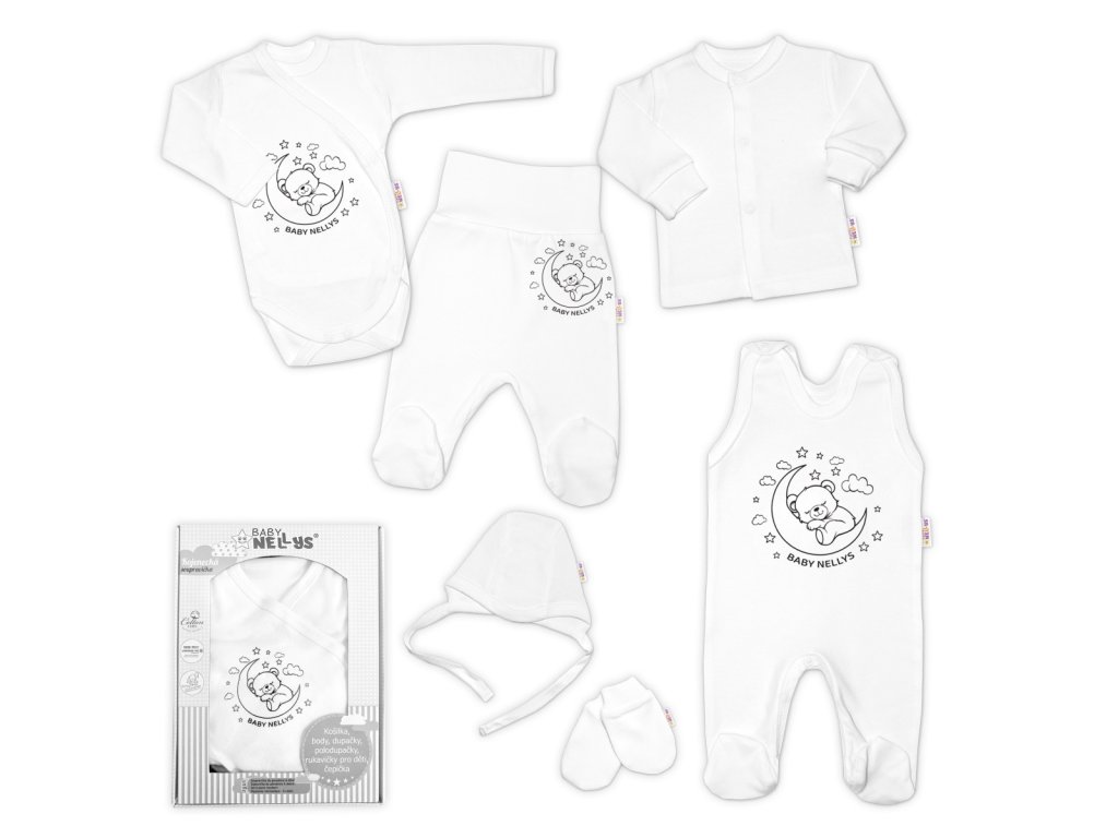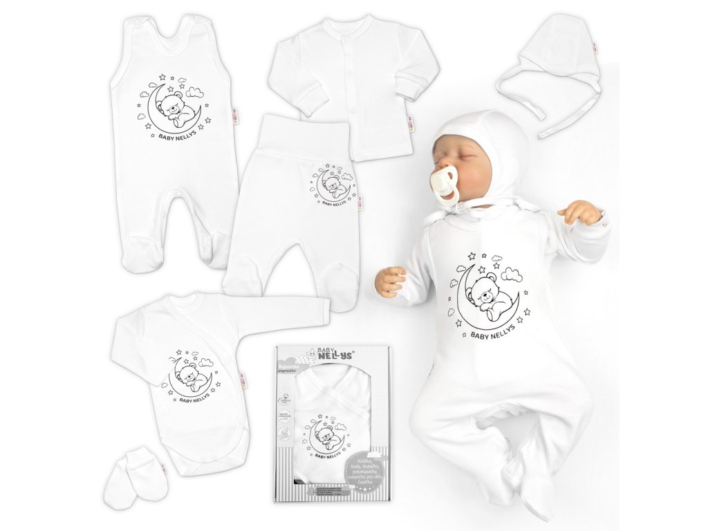 Baby Nellys ® = česká značka - záruka kvality a spokojenosti. Krásná soupravička nejen do porodnice v dárkové krabičce. Vhodná i jako dárek ! Soupravička obsahuje: Čepičku. Rukavičky 2ks (1pár). Body dlouhý rukávek. Kabátek. Polodupačky. Dupačky. Materiál: 100% kvalitní bavlna. Rozměry: Vel. 50 Body dlouhý rukávek: hrudník 2 x18 cm , délka rukávku od krku 20 cm , délka od ramen k rozkroku 32 cm. Kabátek: hrudník 2 x 19 cm, délka rukávu od krku 20 cm, délka 23 cm. Polodupačky: délka od pasu k patičkám 24 cm, pas 2 x 14 cm (měřeno v klidu). Dupačky: hrudník 2 x 19 cm, délka po patičku 33 cm. Čepička: hloubka 13 cm, obvod 2 x 15 cm. Rukavičky: cca 7 cm. Vel. 56 Body dlouhý rukávek: hrudník 2 x19 cm , délka rukávku od krku 21 cm , délka od ramen k rozkroku 33 cm. Kabátek: hrudník 2 x 21 cm, délka rukávu od krku 23 cm, délka 25 cm. Polodupačky: délka od pasu k patičkám 27 cm, pas 2 x 15 cm (měřeno v klidu). Čepička: hloubka 13 cm, obvod 2 x 17 cm. Rukavičky: cca 8 cm. Dupačky: hrudník 2 x 21 cm, délka po patičku 38 cm. Vel. 62 Body dlouhý rukávek: hrudník 2 x 21 cm , délka rukávku od krku 23 cm , délka od ramen k rozkroku 37 cm. Kabátek: hrudník 2 x 22 cm, délka rukávu od krku 24 cm, délka 27 cm. Polodupačky: délka od pasu k patičkám 31 cm, pas 2 x 16 cm (měřeno v klidu). Čepička: hloubka 14 cm, obvod 2 x 18 cm. Rukavičky: cca 9 cm. Dupačky: hrudník 2 x 23 cm, délka po patičku 45 cm. Uvedené rozměry se mohou minimálně lišit +- 0,5-1,5cm.Doplňkové parametry