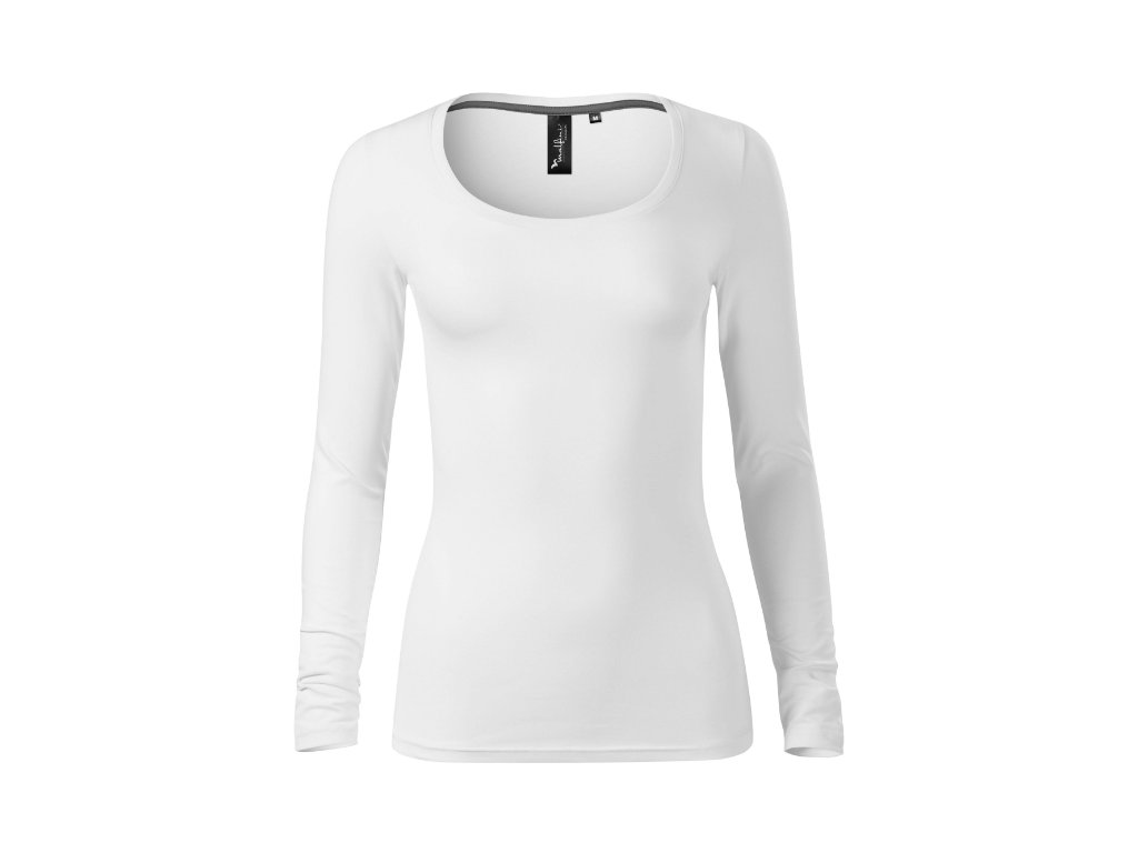 strečový materiál udržující stálost tvaru přiléhavý střih s bočními švy hlubší kulatý výstřih úzký lem průkrčníku z žebrového úpletu 1:1 s 5 % elastanu vnitřní část průkrčníku začištěna kontrastní páskou zpevnění ramenních švů páskou dlouhé rukávySingle Jersey, 95 % bavlna 5 % elastan