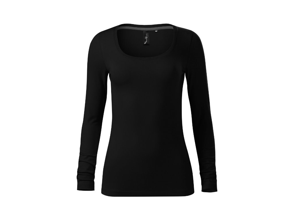 strečový materiál udržující stálost tvaru přiléhavý střih s bočními švy hlubší kulatý výstřih úzký lem průkrčníku z žebrového úpletu 1:1 s 5 % elastanu vnitřní část průkrčníku začištěna kontrastní páskou zpevnění ramenních švů páskou dlouhé rukávySingle Jersey, 95 % bavlna 5 % elastan