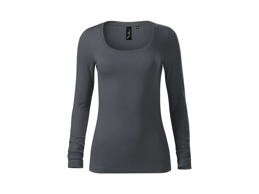 strečový materiál udržující stálost tvaru přiléhavý střih s bočními švy hlubší kulatý výstřih úzký lem průkrčníku z žebrového úpletu 1:1 s 5 % elastanu vnitřní část průkrčníku začištěna kontrastní páskou zpevnění ramenních švů páskou dlouhé rukávySingle Jersey, 95 % bavlna 5 % elastan