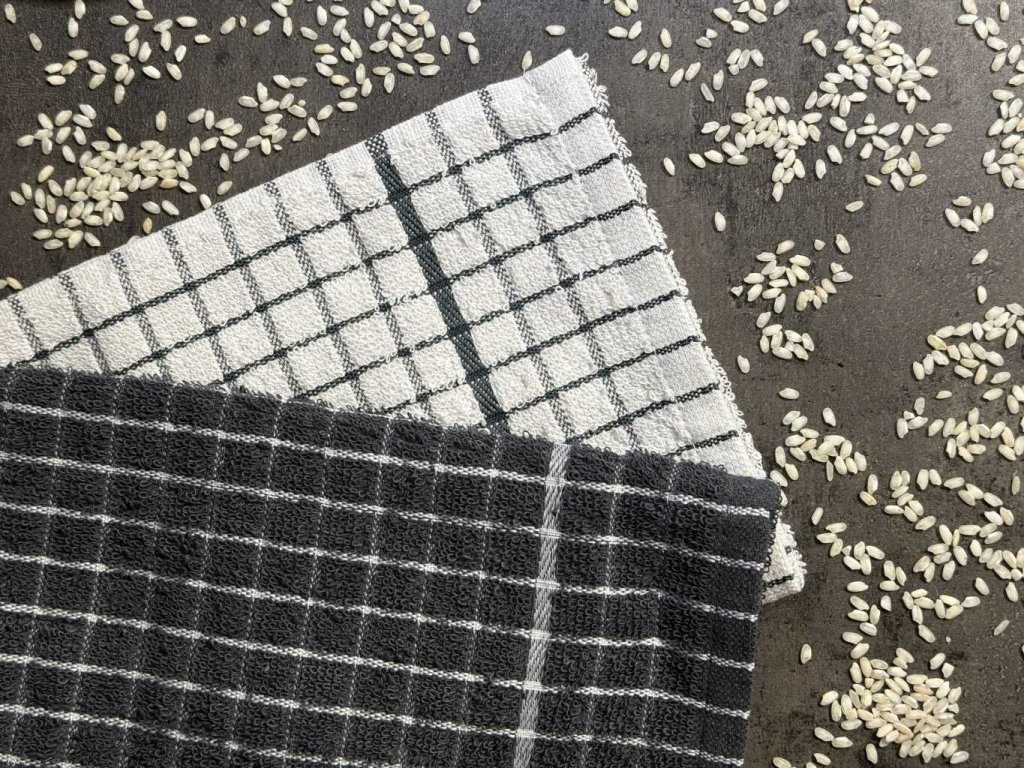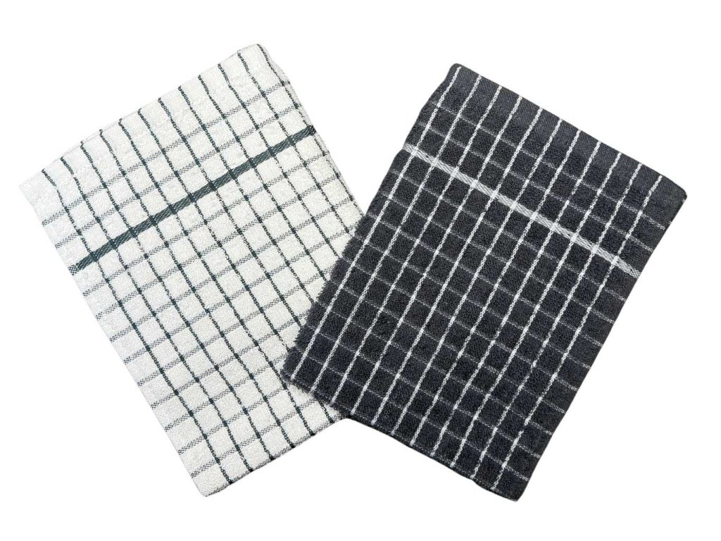 Moderní froté utěrky Olga šedobílá v praktickém balení po dvou kusech jsou skvělým doplňkem do každé kuchyně. Jedna utěrka je bílá se šedým kárem, druhá šedá s bílým kárem – decentní a elegantní design, který ladí s většinou interiérů. Vyrobeno v České republice firmou DADKA VRACOV.