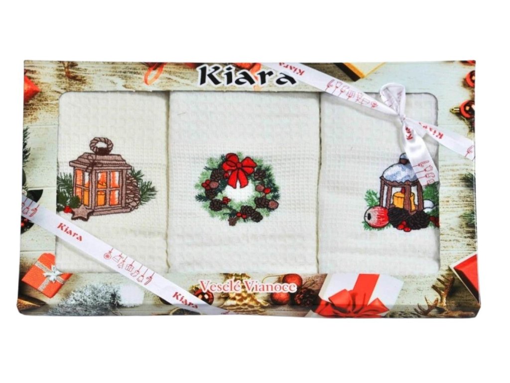 Luxusní sada tří vánočních utěrek s výšivkami luceren a věnečku v dárkovém balení. Stylový doplněk do kuchyně nebo krásný dárek pro vaše blízké.