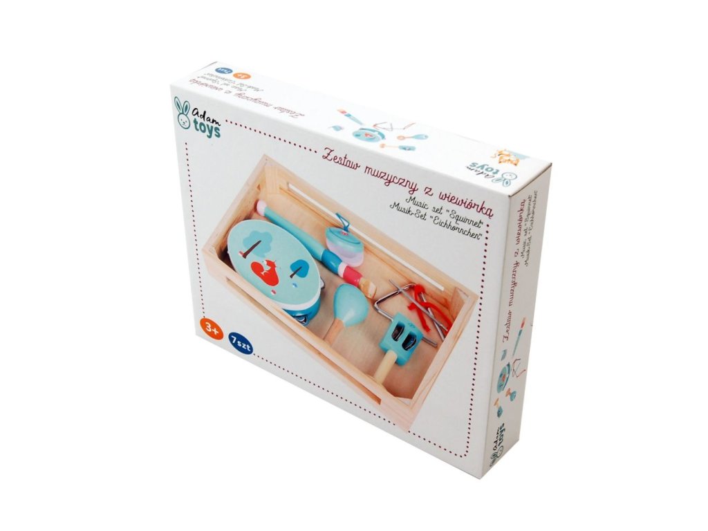 Adam Toys Sada hudebních nástrojů. Hudební sada byla navržena tak, aby vyvolala zájem o hudbu od útlého věku. Díky svému obsahu se dítě může naučit různé zvuky. Sada obsahuje následující prvky: - tamburína s membránou zdobenou roztomilou veveričkou - tamburína má štyri zvony, - farebnú píšťalku, - rumba guľu s kvetinou, - kastanety s hubami, - zvony na hriadeli s listom - kovový hudobný trojuholník s palicou, - drevená krabička, vďaka ktorej sa všetko po hraní dostane na svoje miesto. Rozmery výrobku: 33 x 27,5 x 5,5cm. Vhodné pro děti od 3+.Doplňkové parametry