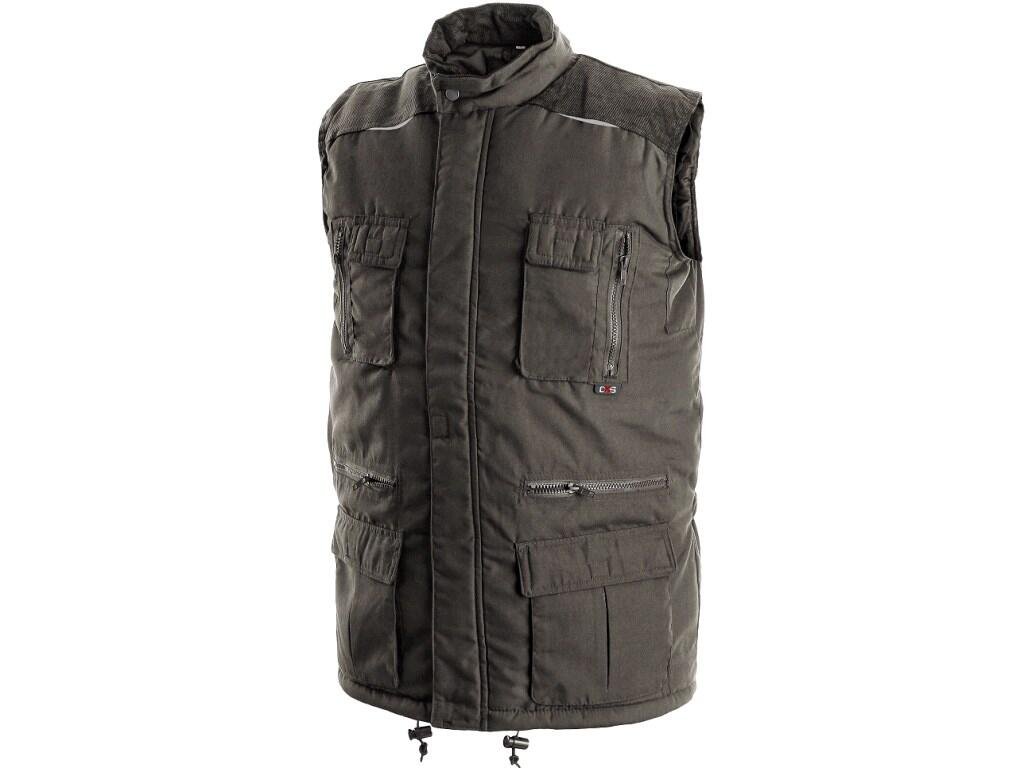 Pánská zateplená vesta, ramena a límec pošitý manšestrem, pružné stažení průramku, zapínání na zip krytý légou, stahování v dolním okraji, 8 vnějších kapes, reflexní doplňky, vnitřní kapsa na zip.