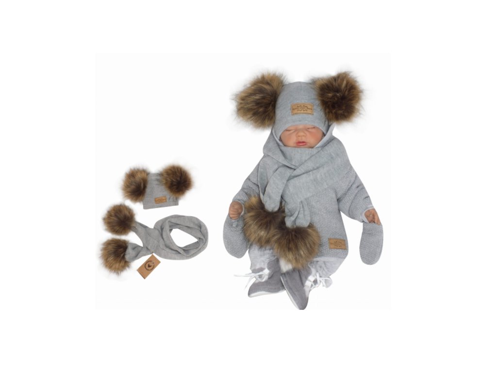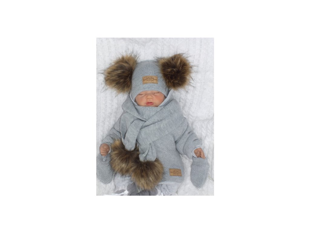 Z&Z Zimní čepice s bambulemi z kožešinky a šálou 2V1, šedá