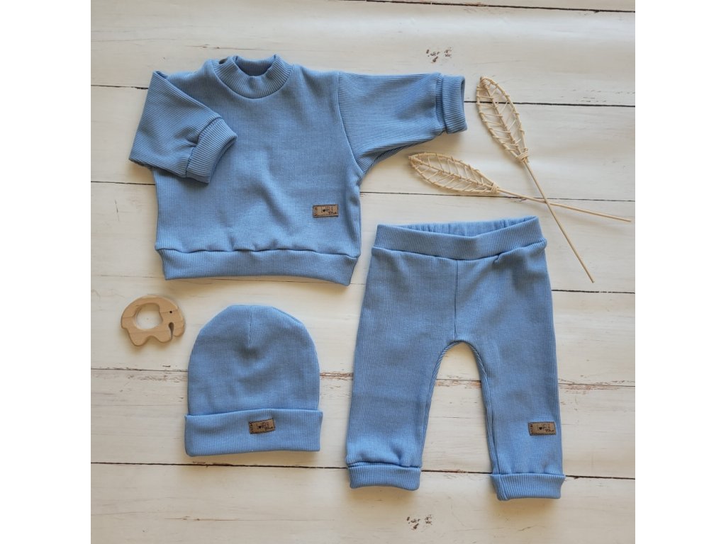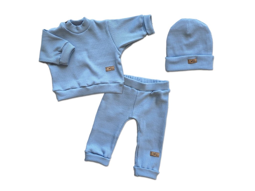3-dílná souprava z žebrovaného úpletu. Mikina má zapínání u krku na cvočky. Zaručuje pohodlí a pohodlí při oblékání. Perfektní pro každé roční období. Dlouhé manžety na rukávech umožňují mikině růst s dítětem. Kalhoty mají velmi elastický pás, díky kterému se kalhoty přizpůsobí každé postavě a prodloužené manžety ve spodní části navíc umožní kalhotám růst s dítětem. Sada obsahuje: Mikinku, tepláčky a čepičku. Materiál: 95% Bavlna 5% elastan. Detailní rozměry:Tepláčky: Vel. 56/62 - délka 35 cm, pas - 16 cm x 2. Vel. 68/74 - délka 41 cm, pas - 21 cm x 2. Vel. 80/86 - délka 48 cm, pas - 23 cm x 2. Detailní rozměry:Mikina: Vel. 56/62 - délka 28 cm, hrudník - 22 cm x 2, rukáv od krku 25 cm. Vel. 68/74- délka 30 cm, hrudník - 27 cm x 2, rukáv od krku 28 cm. Vel. 80/86 - délka 33 cm, hrudník - 28 cm x 2, rukáv od krku 31 cm. Detailní rozměry:Čepice: Vel. 56/62 - průměr 16 cm, hloubka 16 cm. Vel. 68/74 - průměr 18 cm, hloubka 18 cm. Vel. 80/86 - průměr 19 cm, hloubka 19 cm. Uvedené rozměry se mohou lišit +- 1-2cm. Při údržbě/praní se vždy řiďte pokyny uvedenými na štítku výrobce!Doplňkové parametry
