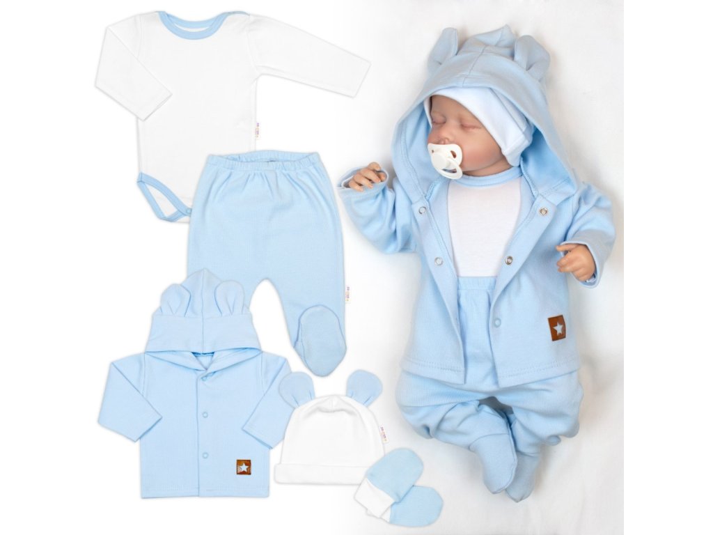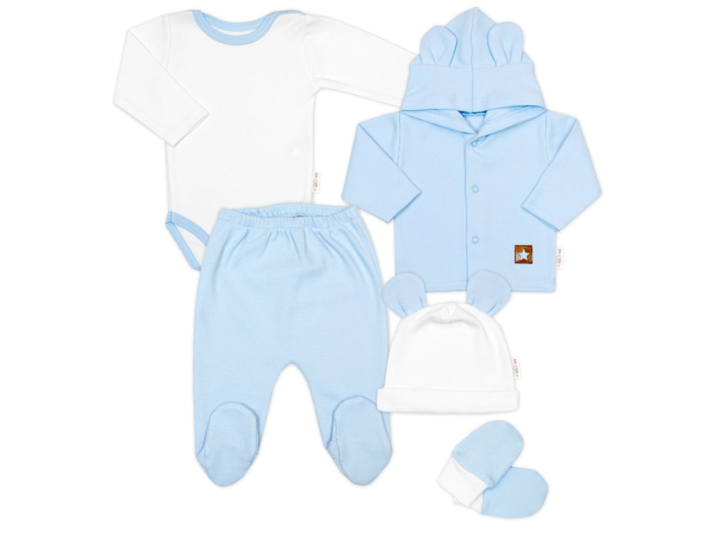 Žebrovaná sada, Star 5D, body, polodupačky, kabátek, čepička, rukavice - modrá, bílá