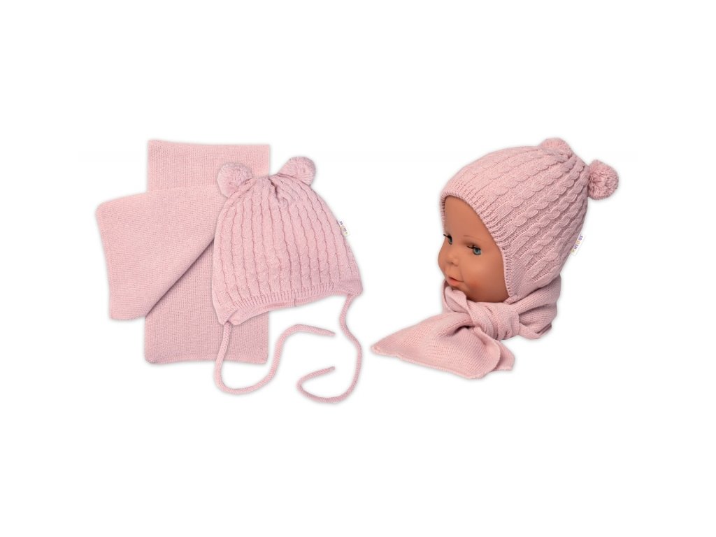 Zimní čepice na zavazování s bambulky + šál, Baby Nellys - pudrově růžová