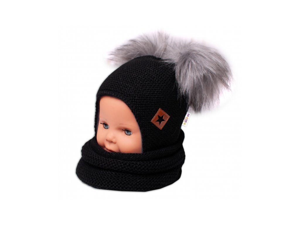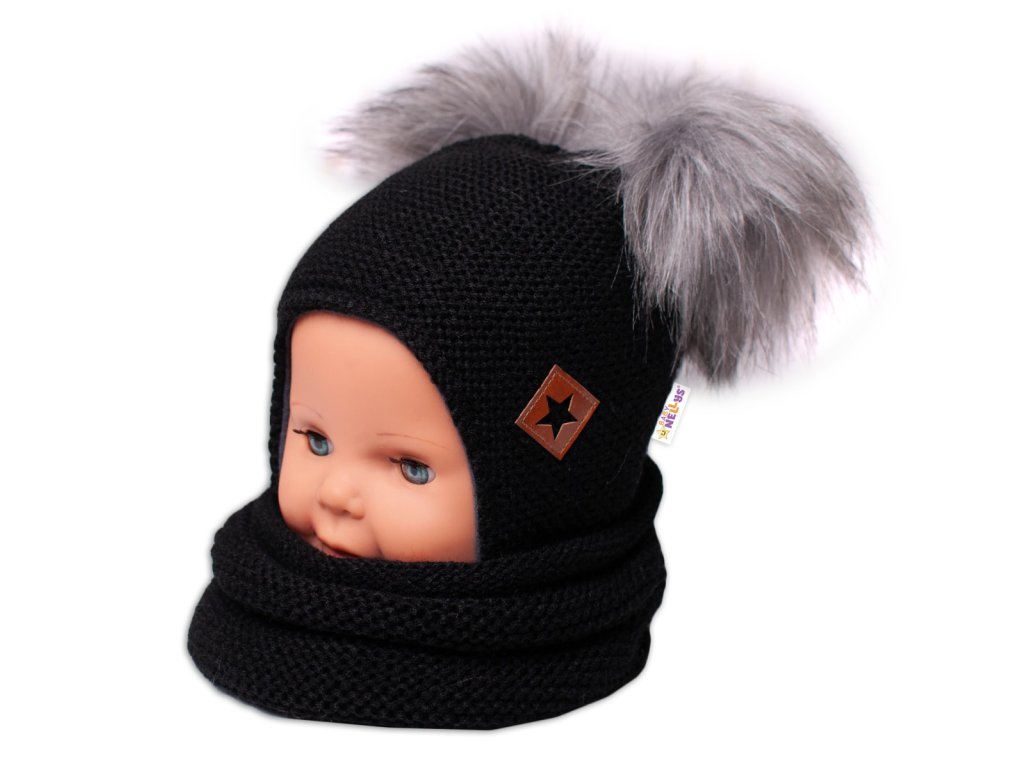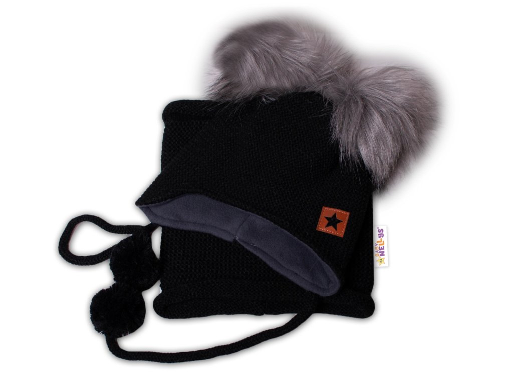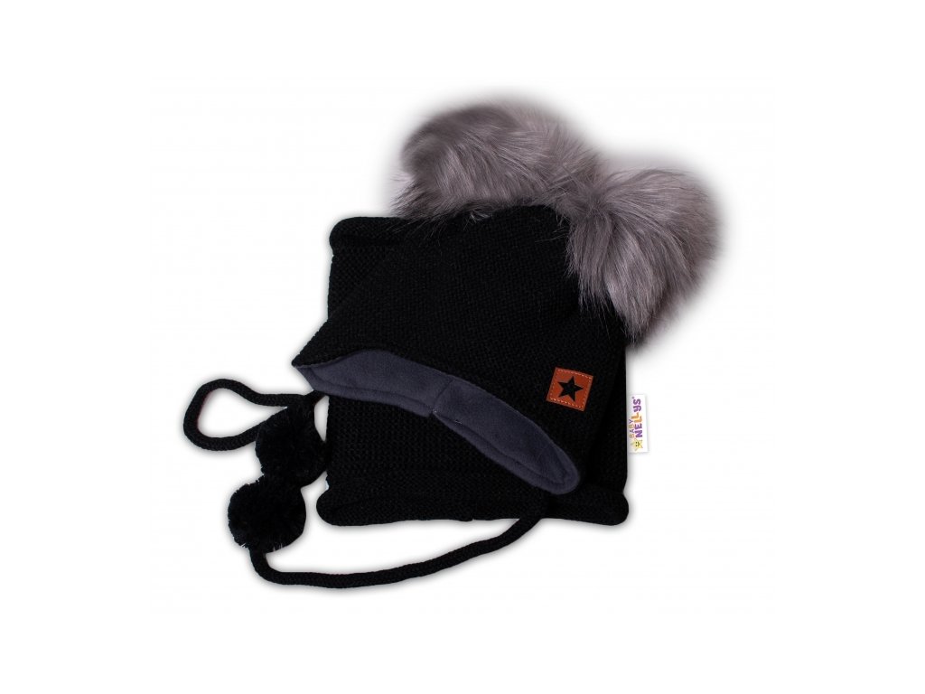 Zimní čepice s fleecem a chlupáčkové bambulky Star + komínek - černá, BABY NELLYS