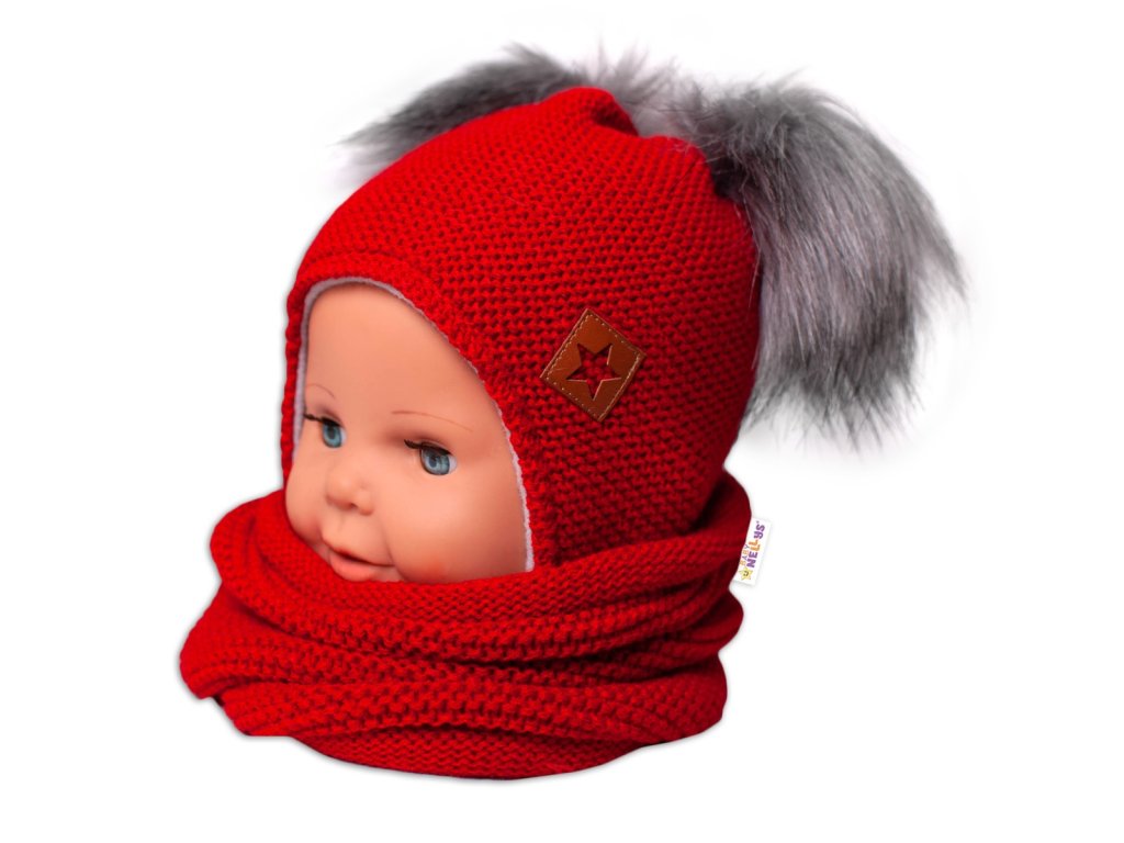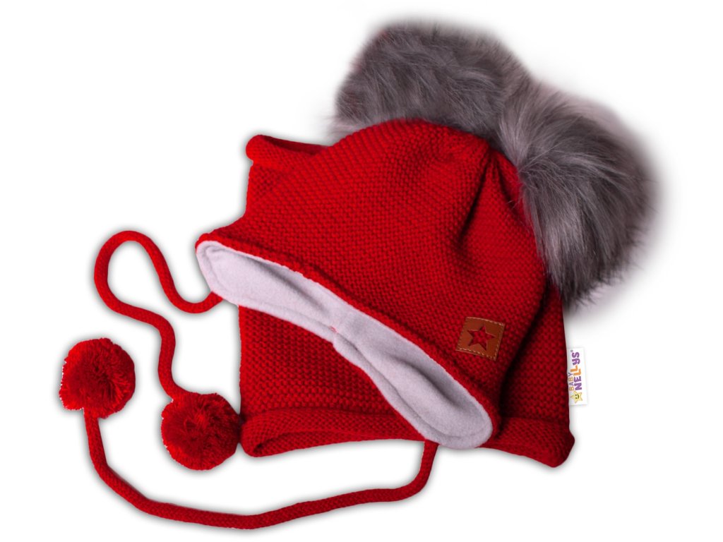 Zimní čepice s fleecem a chlupáčkové bambulky Star + komínek - červená