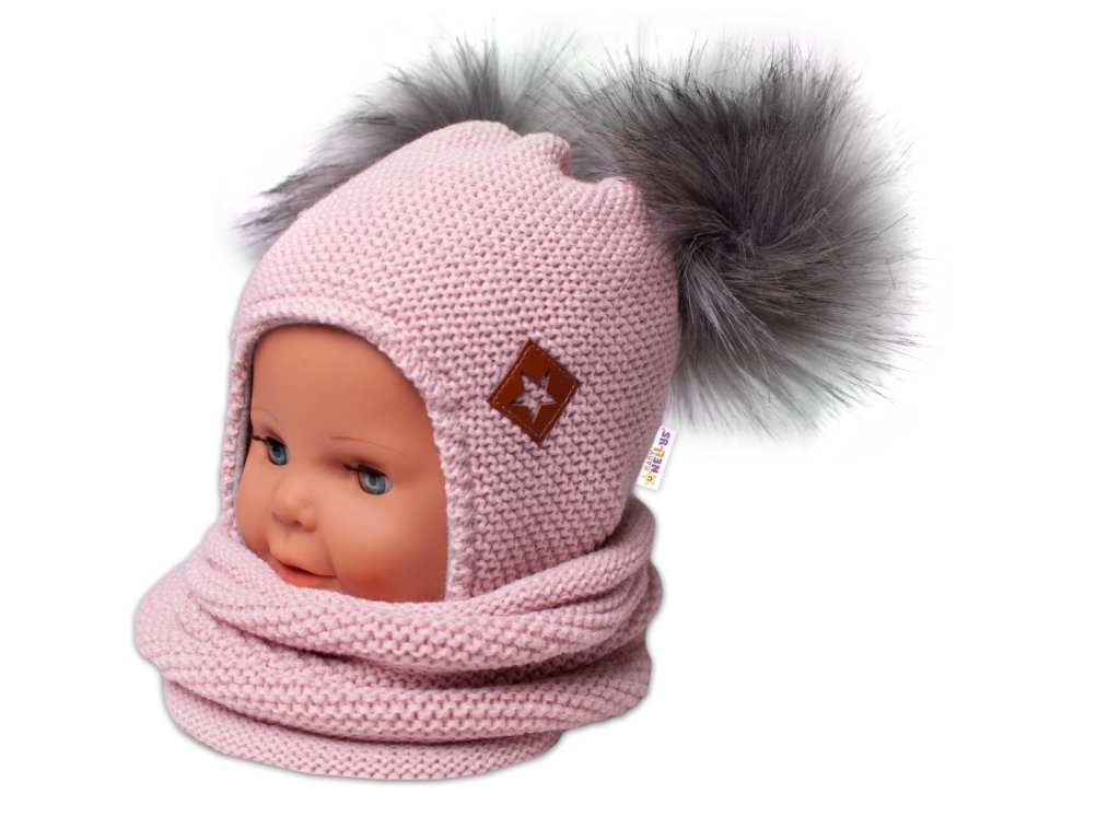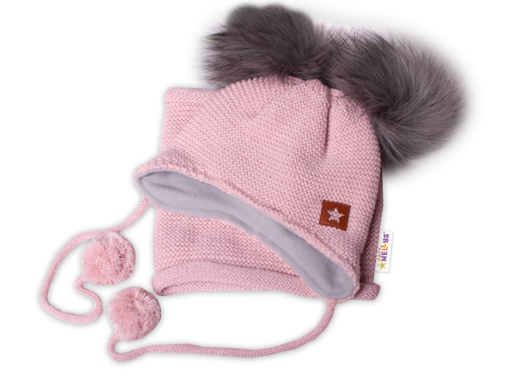 Zimní čepice s fleecem a chlupáčkové bambulky Star + komínek - pudrová