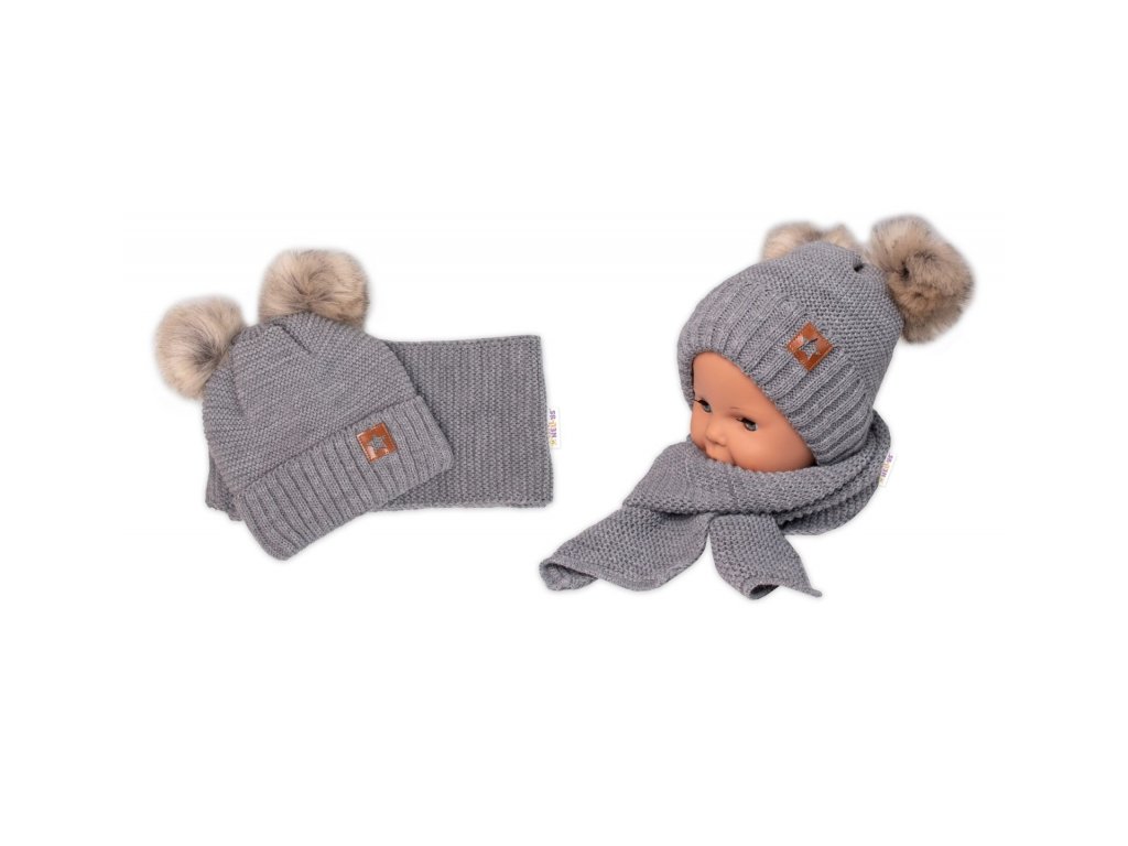 Zimní čepice s kožešinovými bambulemi + šál Baby Nellys Star - šedá, 6/24 měsíců