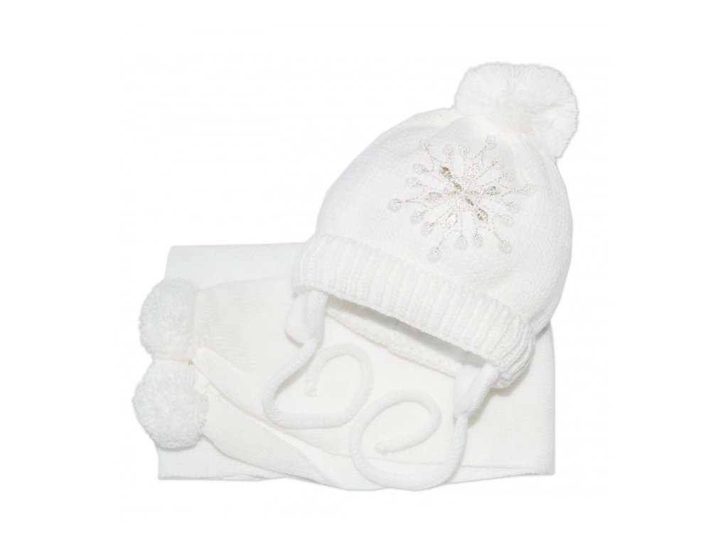 Zimní čepička s šálou - Sněhová vločka v bílé, 0-6m